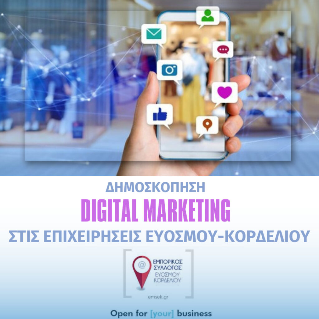 Ο Εμπορικός Σύλλογος Ευόσμου Κορδελιού με αφορμή το σεμινάριο Digital Marketing που θα πραγματοποιήσει τη Δευτέρα 21 Νοεμβρίου και ώρα 17:00 στην αίθουσα του Πολιτιστικού Κέντρου Ευόσμου, σας καλεί να συμμετέχετε στην παρακάτω δημοσκόπηση με στόχο τη σκιαγράφηση του Digital Profile του εμπορικού κόσμου του Δήμου μας.