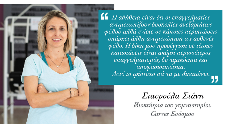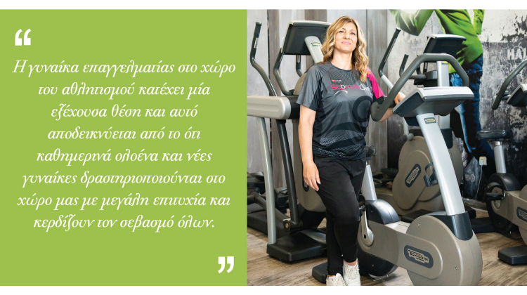 Η γυναίκα επαγγελματίας στο χώρο του αθλητισμού κατέχει μία εξέχουσα θέση και αυτό αποδεικνύεται από το ότι καθημερινά ολοένα και νέες γυναίκες δραστηριοποιούνται στο χώρο μας με μεγάλη επιτυχία και κερδίζουν τον σεβασμό όλων. Το 1994 που άνοιξα το γυμναστήριο αντιμετώπισα πολλές δυσκολίες στο να δεχτεί ο κόσμος μία γυναίκα σαν υπεύθυνη γυμναστηρίου, αλλά με τις γνώσεις τόσο τις προσωπικές όσο και της ομάδας με την οποία συνεργαζόμουν, κατάφερα να κερδίσω την εκτίμηση του κόσμου που λαμβάνω ακόμα και σήμερα, μετά από 27 ολόκληρα χρόνια.