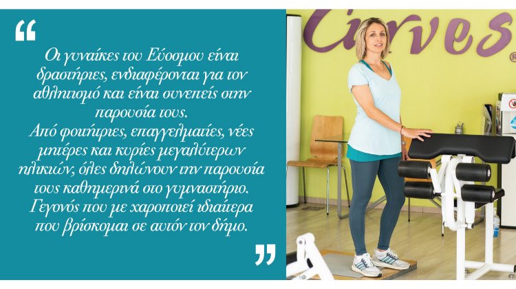 Μπορώ σίγουρα να μιλήσω για τον γυναικείο πληθυσμό του Εύοσμου. Η δεκάχρονη παρουσία μου στον Εύοσμο μου επιτρέπει να πως οι γυναίκες του Εύοσμου είναι δραστήριες, ενδιαφέρονται για τον αθλητισμό και είναι συνεπείς στην παρουσία τους. Από φοιτήτριες, επαγγελματίες, νέες μητέρες και κυρίες μεγαλύτερων ηλικιών, όλες δηλώνουν την παρουσία τους καθημερινά στο γυμναστήριο. Γεγονός που με χαροποιεί ιδιαίτερα που βρίσκομαι σε αυτόν τον δήμο.