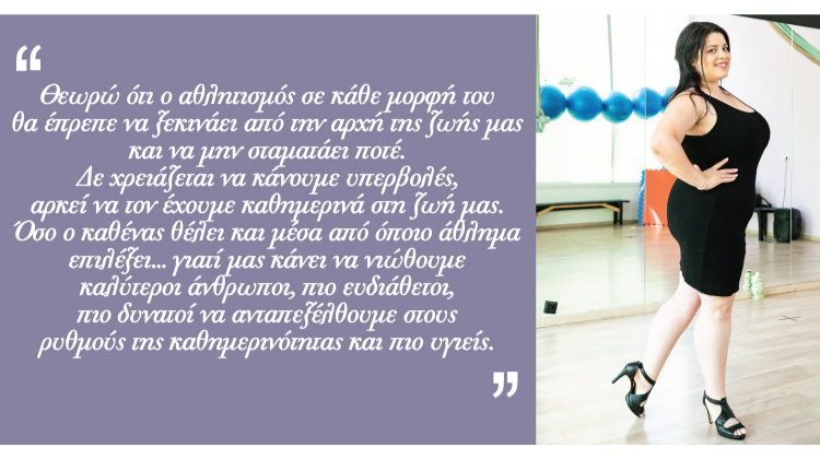 Ο χορός σαν άθλημα σίγουρα προσφέρει μία σωματική υγεία αλλά θα μου επιτρέψετε να σταθώ περισσότερο στην πνευματική και ψυχική υγεία που μπορεί να προσφέρει. Το να αθλείσαι μέσα από το χορό σου δίνει ένα πολύ βασικό πλεονέκτημα και πολλές φορές ο κόσμος δεν καταλαβαίνει πόσο καλή γυμναστική μπορεί να κάνει απλά χορεύοντας! Είναι τόσο ευδιάθετο το κλίμα στις αίθουσες χορού σε συνδυασμό με τη μουσική που πάντα μας κάνει να αισθανόμαστε όμορφα και, φυσικά, με σωστά καταρτισμένους δασκάλους. Τα αποτελέσματα άσκησης στο σώμα μας είναι πολύ καλά και μάλιστα χωρίς κάποιος, ο οποίος δυσκολεύεται και μόνο στην ιδέα της άσκησης, να χρειαστεί να σκεφτεί ούτε λεπτό ότι εκείνη τη στιγμή ζορίζεται. Θεωρώ ότι ο αθλητισμός σε κάθε μορφή του θα έπρεπε να ξεκινάει από την αρχή της ζωής μας και να μην σταματάει ποτέ. Δε χρειάζεται να κάνουμε υπερβολές, αρκεί να τον έχουμε καθημερινά στη ζωή μας. Όσο ο καθένας θέλει και μέσα από όποιο άθλημα επιλέξει, γιατί μας κάνει να νιώθουμε καλύτεροι άνθρωποι, πιο ευδιάθετοι, πιο δυνατοί να ανταπεξέλθουμε στους ρυθμούς της καθημερινότητας και πιο υγιείς.