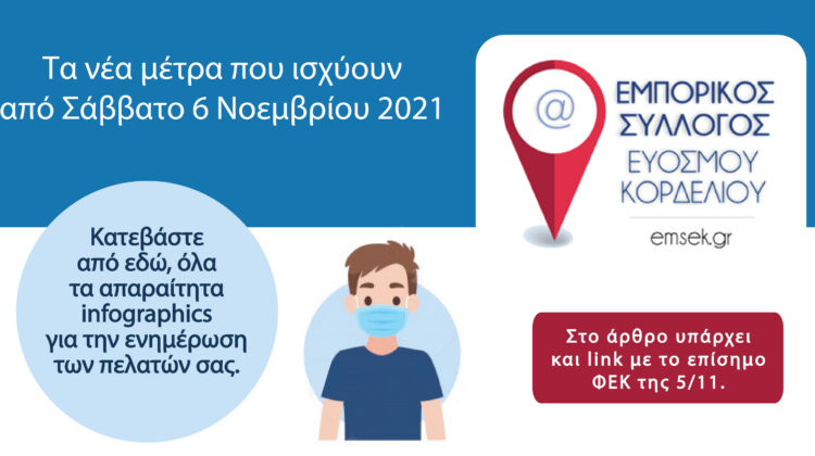 Αγαπητά μέλη ΕΜΣΕΚ, Ετοιμάσαμε μια νέα αφίσα για την ενημέρωση των πελατών σας, σύμφωνα με τους νέους κανονισμούς πρόσβασης στις εμπορικές δραστηριότητες που θα ξεκινήσουν από ην Δευτέρα 22 Νοεμβρίου 2021. Παρακάτω μπορείτε να κατεβάσετε όλα τα αρχεία