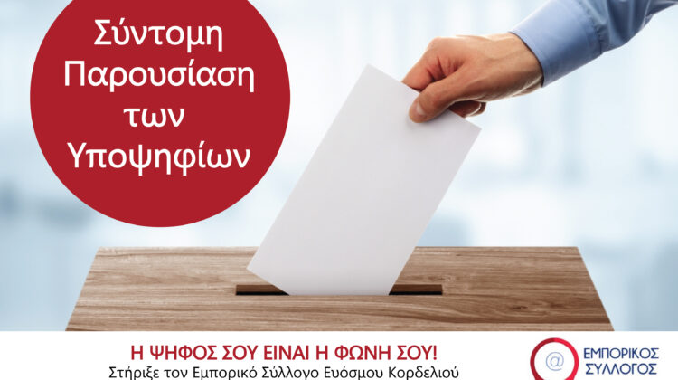 Η ΨΗΦΟΣ ΣΟΥ ΕΙΝΑΙ Η ΦΩΝΗ ΣΟΥ! Στήριξε τον Εμπορικό Σύλλογο Ευόσμου Κορδελιού με την συμμετοχή σου στην εκλογική διαδικασία! Οι επαγγελματίες έχουν φωνή! Παρακάτω μπορείτε να διαβάσετε ένα σύντομο βιογραφικό των υποψηφίων με την σειρά εμφάνισής τους
