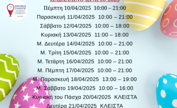 Ο Εμπορικός Σύλλογος Ευόσμου Κορδελιού ανακοινώνει το προτεινόμενο ωράριο για τη λειτουργία των καταστημάτων την περίοδο του Πάσχα! Όλα τα μέλη μας θα λάβουν το ωράριο μέσω email ώστε να μπορούν να το χρησιμοποιήσουν και να το αναρτήσουν